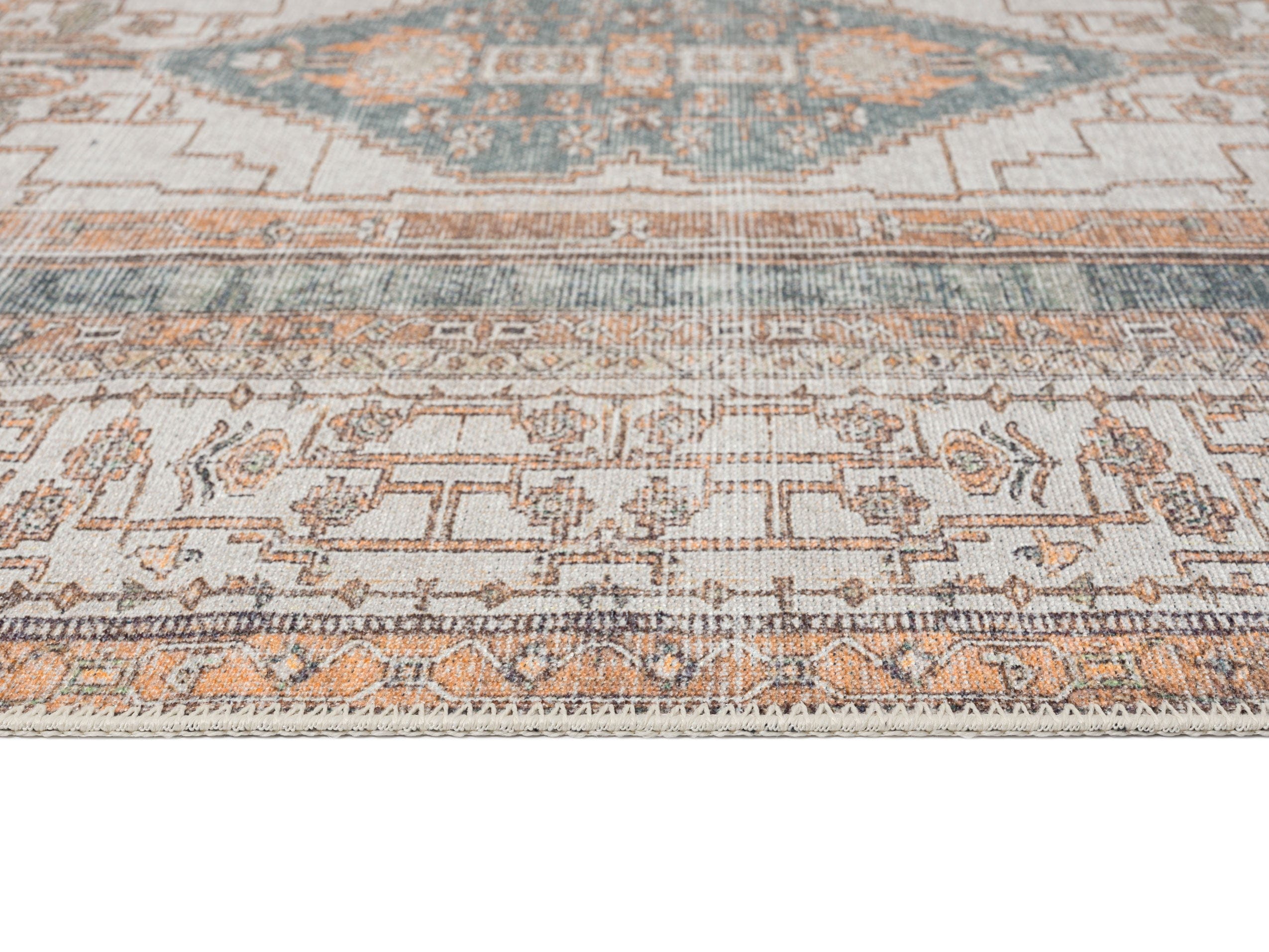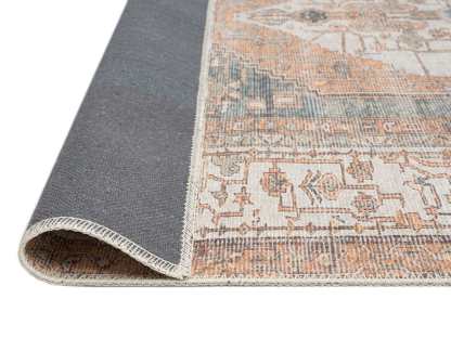 A bordered distressed style rug with elaborate motifs and ornate patterns in warm orange, neutral cream brown and green multi-tones. The beautiful design is printed on top of the fibres giving it a faded effect with a subtle vintage look. A timeless and elegant addition to a modern, classic, bohemian or vintage space.